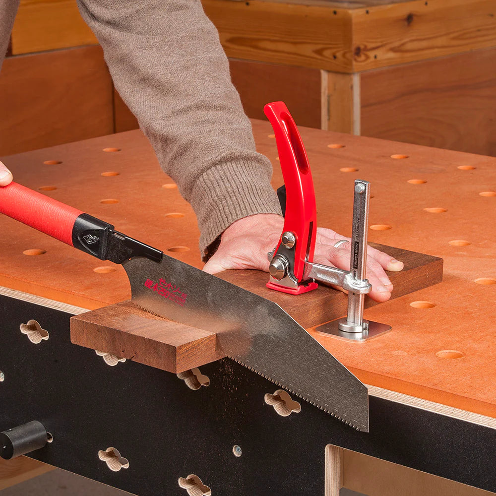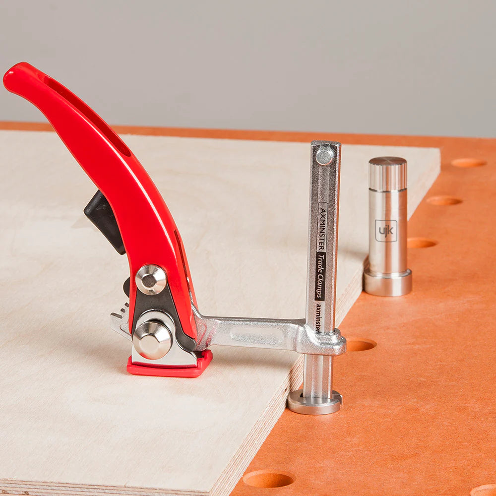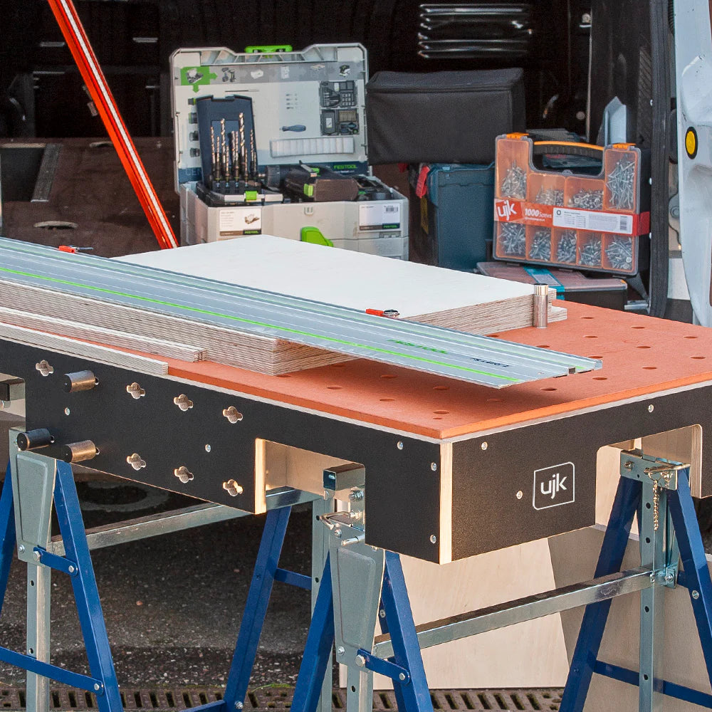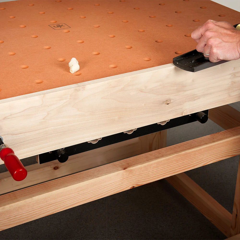 Precision meets durability with the UJK HDF Valchromat Top. This 1,102mm x 718mm work surface boasts a grid of perfectly aligned 20mm chamfered bench dog holes.