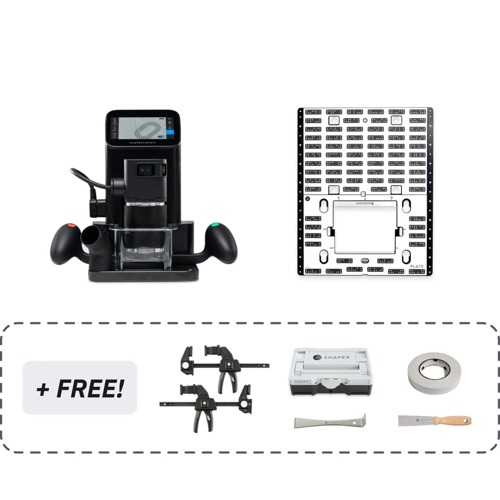 Shaper Tools Origin and Plate Bundle includes both Shaper Tools' Origin handheld CNC router and the versatile Shaper Tools Plate reusable template.